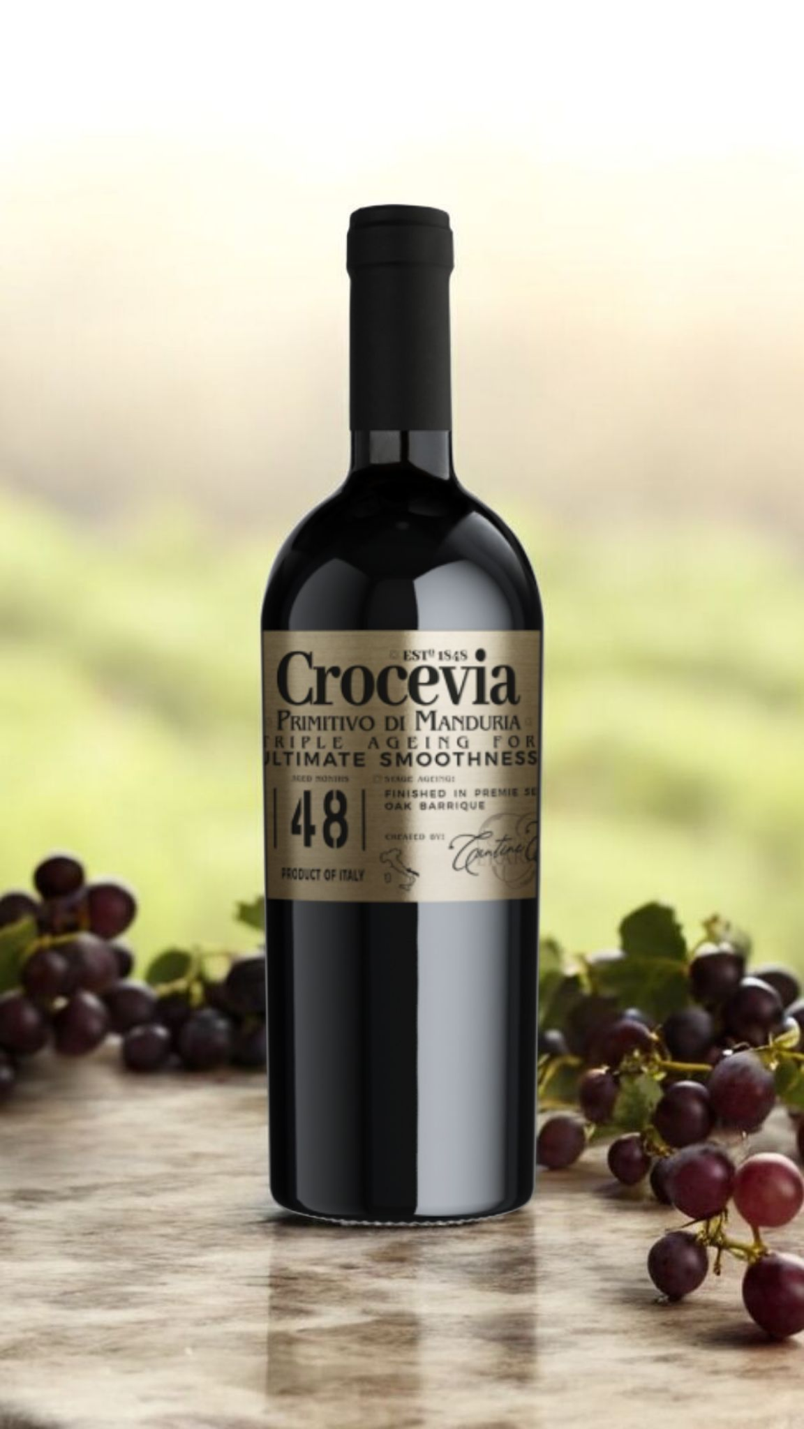 Storia del vitigno:Vino ottenuto da uve di Primitivo, provenienti da alberello di età media 70 anni, coltivati nella piana di Manduria, precisamente collocati lungo la fascia costiera e baciati dalle brezze provenienti dal mare Ionio, che ne influenzano significativamente struttura e profumi, conferendogli questa personalità.