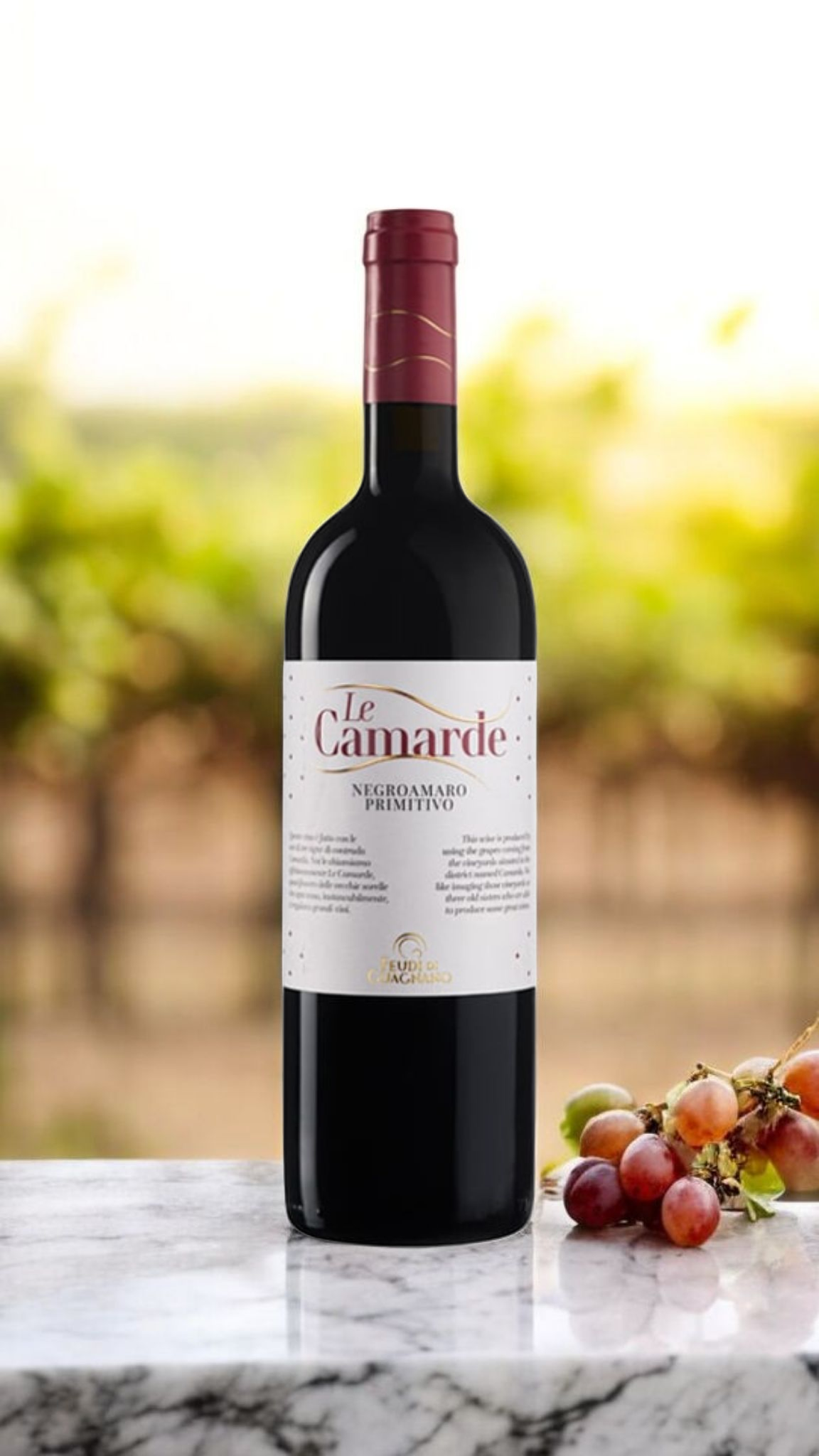 denominata Camarda. Qui la cantina possiede diverse vigne di Negroamaro e Primitivo che assieme contribuiscono alla creazione di questo superbo vino.Questo vino rappresenta la perfetta sintesi enologica dei due vitigni autoctoni per eccellenza del Salento.